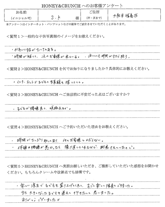 大阪で七五三の子供写真館撮影スタジオならハニーアンドクランチHOME > アンケート(口コミ・評判情報) > 大阪市福島区から1歳誕生日写真撮影でご来店のS・Kさま・アンケート(口コミ・評判情報)140