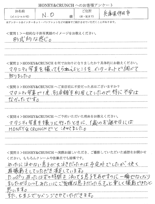 大阪で七五三の子供写真館撮影スタジオならハニーアンドクランチHOME > アンケート(口コミ・評判情報) > 兵庫県伊丹市から1歳誕生日写真撮影でご来店のN・Oさま・アンケート(口コミ・評判情報)165