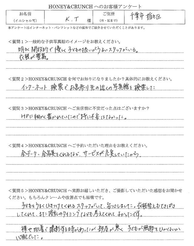 大阪で七五三の子供写真館撮影スタジオならハニーアンドクランチHOME > アンケート(口コミ・評判情報) > 千葉市稲毛区からお宮参り&百日祝写真撮影でご来店のK・Tさま・アンケート(口コミ・評判情報)173