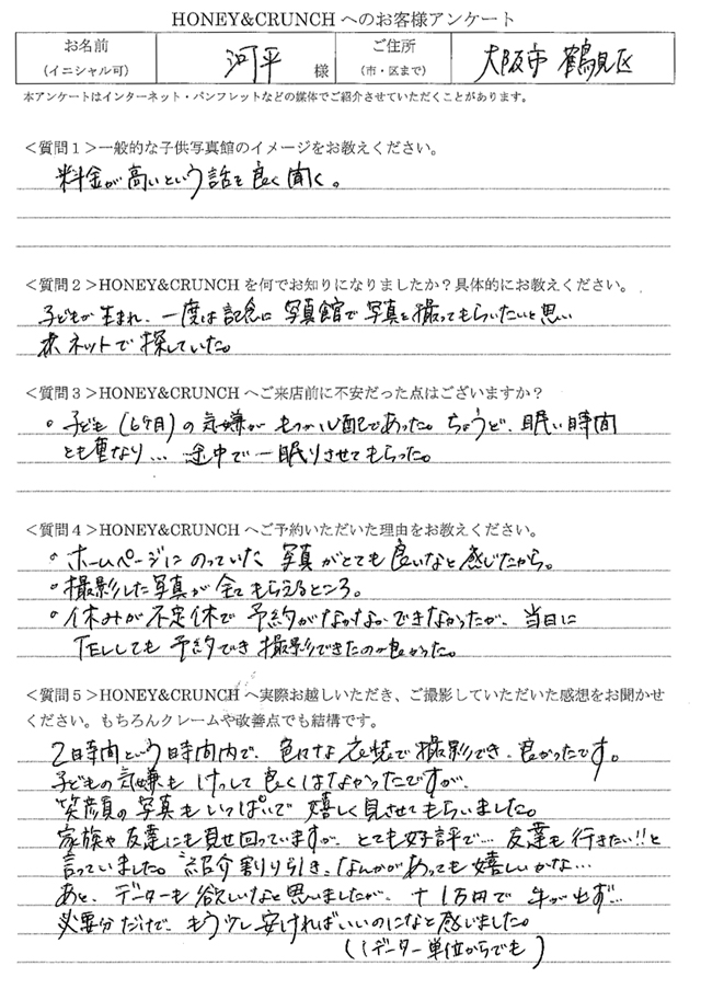 大阪で七五三の子供写真館撮影スタジオならハニーアンドクランチHOME > アンケート(口コミ・評判情報) > 大阪市鶴見区からハーフバースデー写真撮影でご来店の河平さま・アンケート(口コミ・評判情報)176