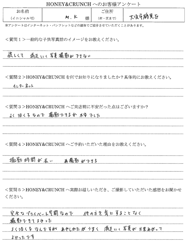 大阪で七五三の子供写真館撮影スタジオならハニーアンドクランチHOME > アンケート(口コミ・評判情報) > 大阪市鶴見区からお宮参り写真撮影でご来店のM・Kさま・アンケート(口コミ・評判情報)208