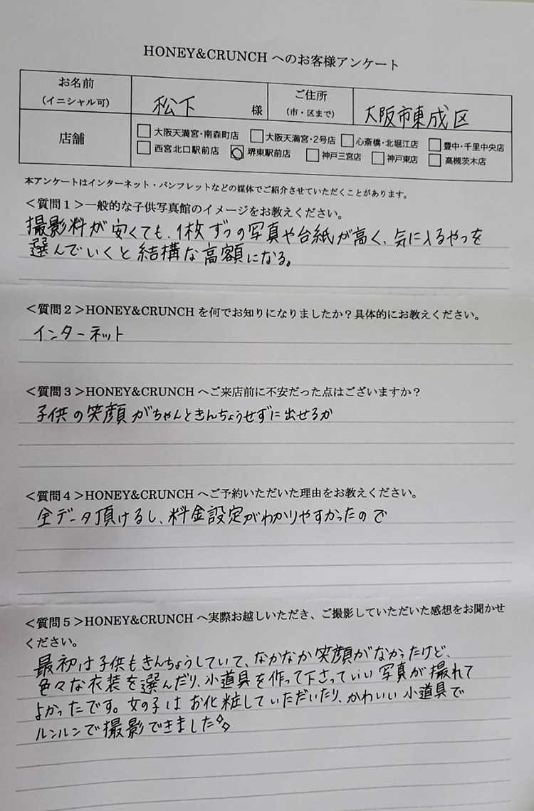 大阪で七五三の子供写真館撮影スタジオならハニーアンドクランチHOME > アンケート(口コミ・評判情報) > 松下様口コミ評判/大阪市城東区より子ども写真撮影/10092連番