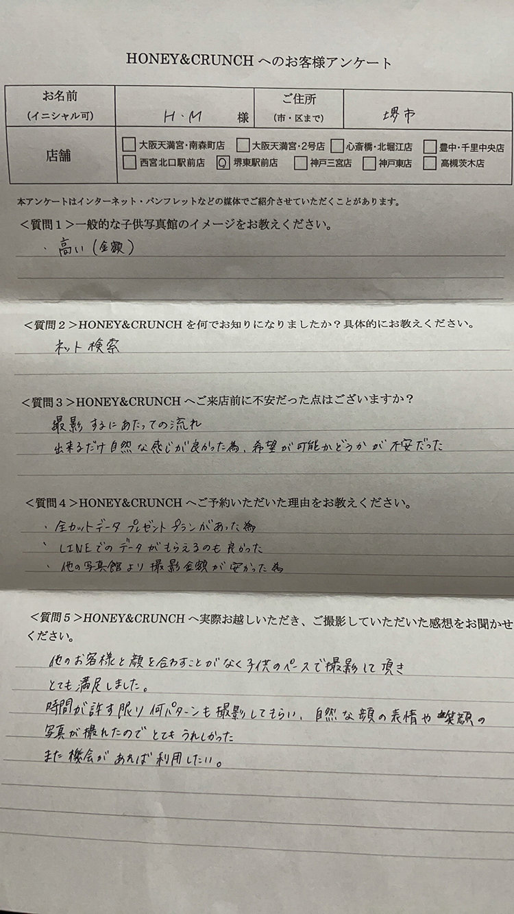 H.M様口コミ評判/堺市より子ども写真撮影/10130連番<質問5>ハニーアンドクランチへ実際お越しいただき、ご撮影していただいた感想をお聞かせください。