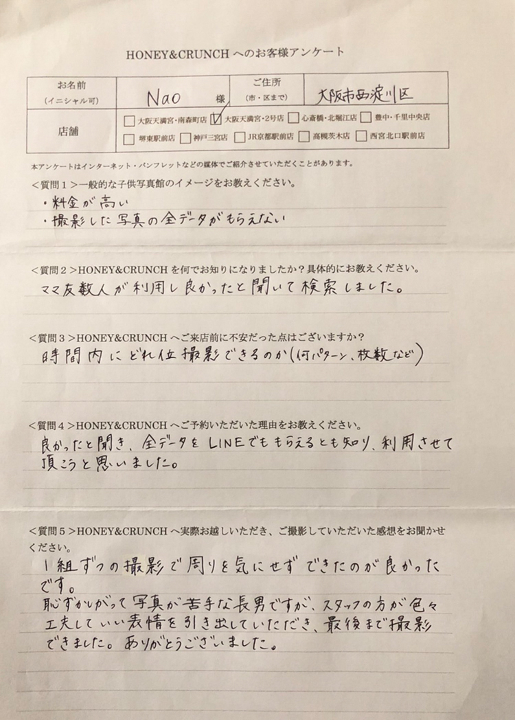 Nao様口コミ評判/大阪市西淀川区より子ども写真撮影/10262連番<質問5>ハニーアンドクランチへ実際お越しいただき、ご撮影していただいた感想をお聞かせください。