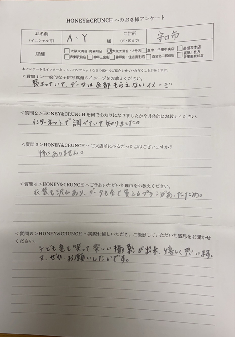 A•Y様口コミ評判/守口市より子ども写真撮影/10321連番<質問5>ハニーアンドクランチへ実際お越しいただき、ご撮影していただいた感想をお聞かせください。