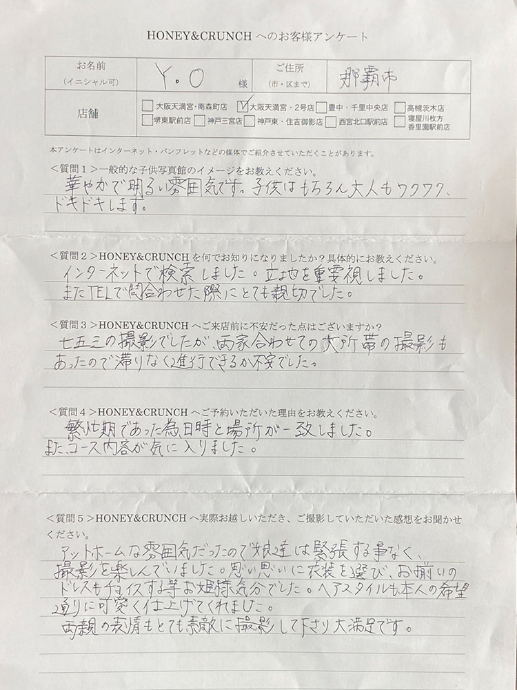 大阪で七五三の子供写真館撮影スタジオならハニーアンドクランチHOME > アンケート(口コミ・評判情報) > Y•O様口コミ評判/那覇市より子ども写真撮影/10323連番