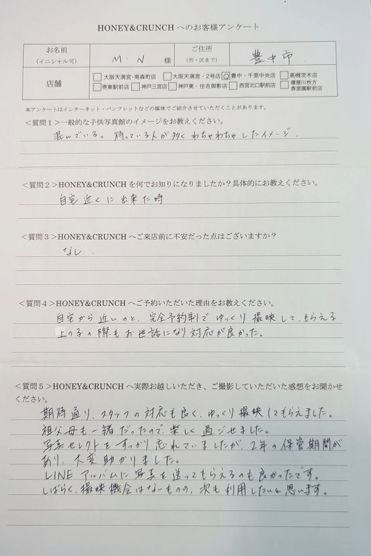 大阪で七五三の子供写真館撮影スタジオならハニーアンドクランチHOME > アンケート(口コミ・評判情報) > M•N様口コミ評判/豊中市より子ども写真撮影/10322連番