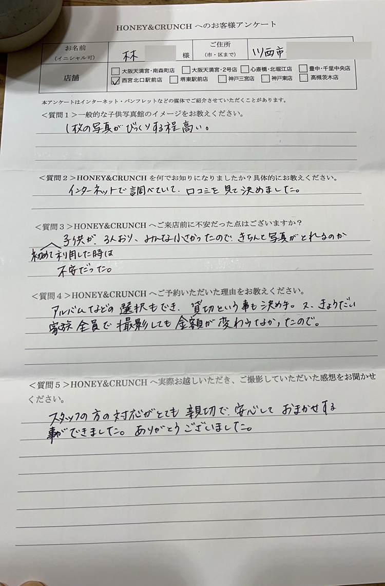 大阪で七五三の子供写真館撮影スタジオならハニーアンドクランチHOME > アンケート(口コミ・評判情報) > 林様口コミ評判/川西市より子ども写真撮影/10357連番