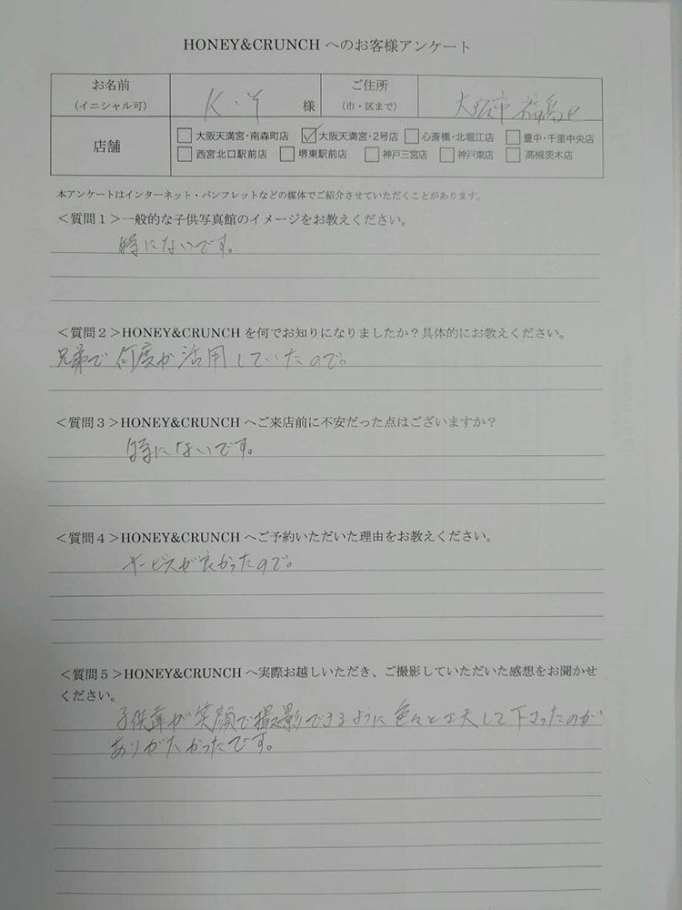 大阪で七五三の子供写真館撮影スタジオならハニーアンドクランチHOME > アンケート(口コミ・評判情報) > K.Y様口コミ評判/大阪市福島区より子ども写真撮影/10356連番