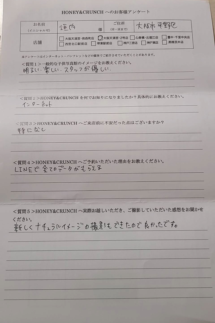 大阪で七五三の子供写真館撮影スタジオならハニーアンドクランチHOME > アンケート(口コミ・評判情報) > 垣内様口コミ評判/大阪市平野区より子ども写真撮影/10382連番