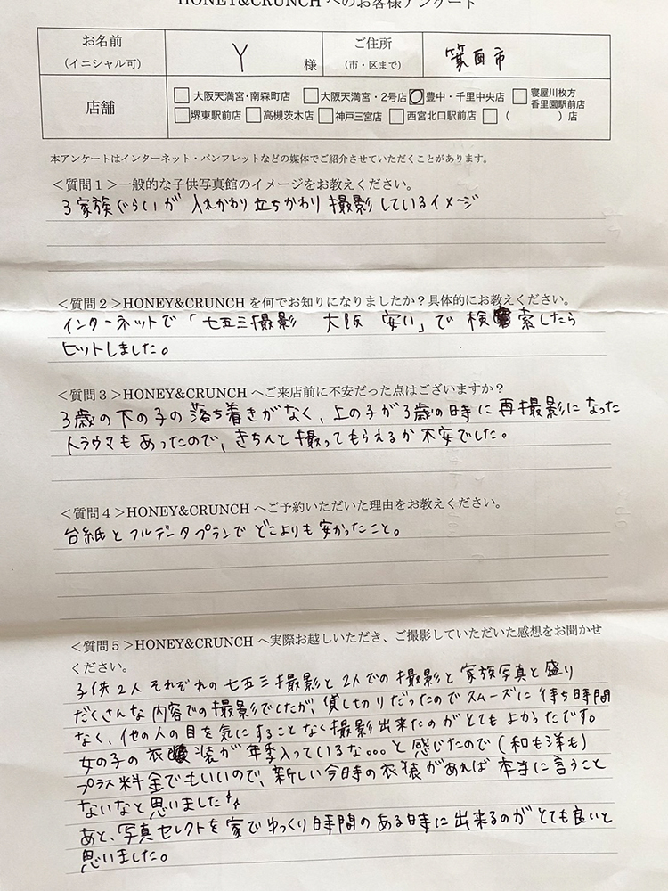 大阪で七五三の子供写真館撮影スタジオならハニーアンドクランチHOME > アンケート(口コミ・評判情報) > Y様口コミ評判/箕面市より子ども写真撮影/10400連番
