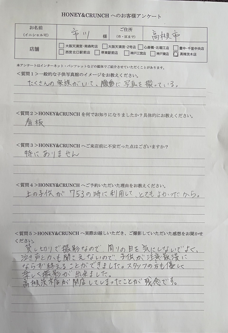 大阪で七五三の子供写真館撮影スタジオならハニーアンドクランチHOME > アンケート(口コミ・評判情報) > 市川様口コミ評判/高槻市より子ども写真撮影/10428連番
