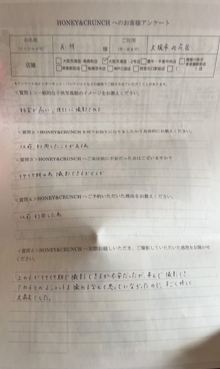 大阪で七五三の子供写真館撮影スタジオならハニーアンドクランチHOME > アンケート(口コミ・評判情報) > A.M様口コミ評判/大阪市此花区より子ども写真撮影/10426連番