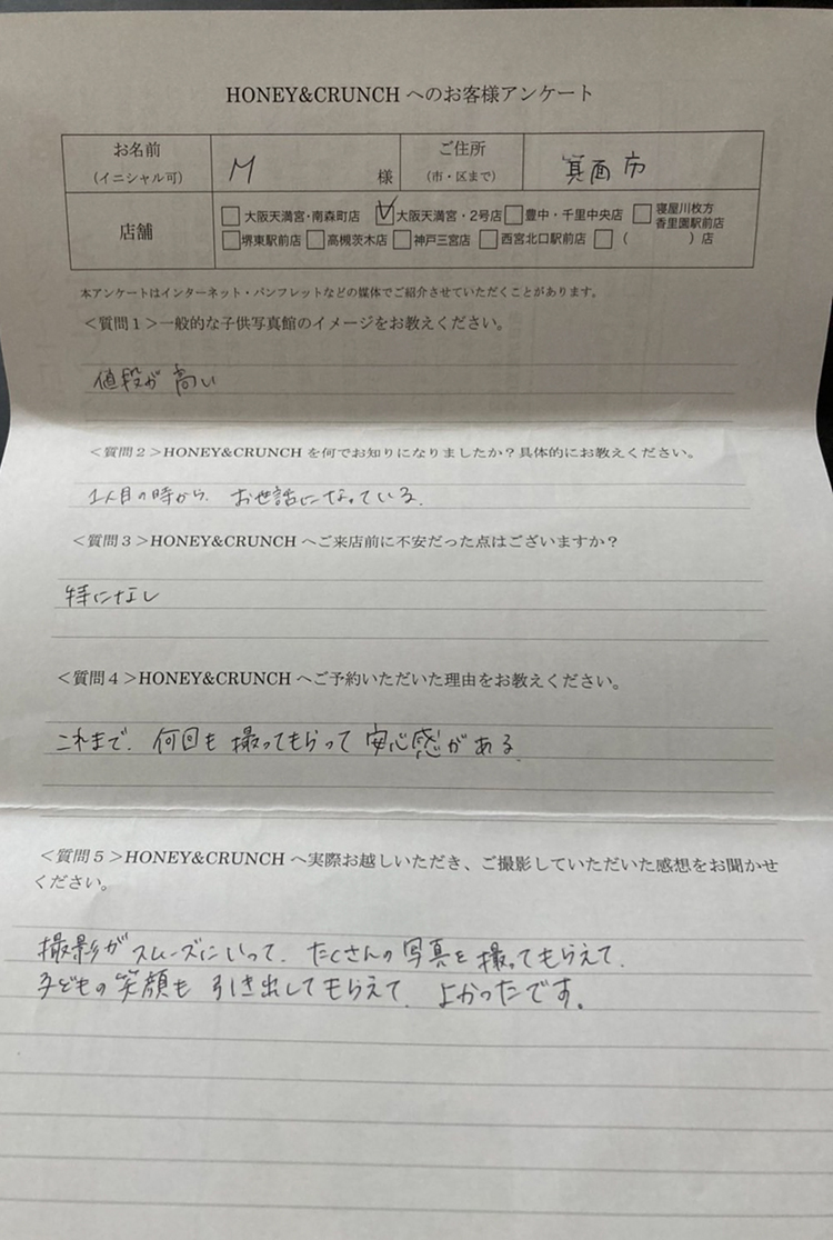 大阪で七五三の子供写真館撮影スタジオならハニーアンドクランチHOME > アンケート(口コミ・評判情報) > M様口コミ評判/箕面市より子ども写真撮影/10435連番