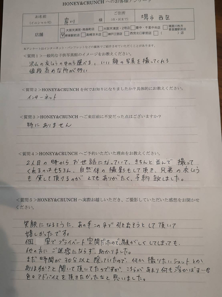 大阪で七五三の子供写真館撮影スタジオならハニーアンドクランチHOME > アンケート(口コミ・評判情報) > 岸川様口コミ評判/堺市より子ども写真撮影/10437連番