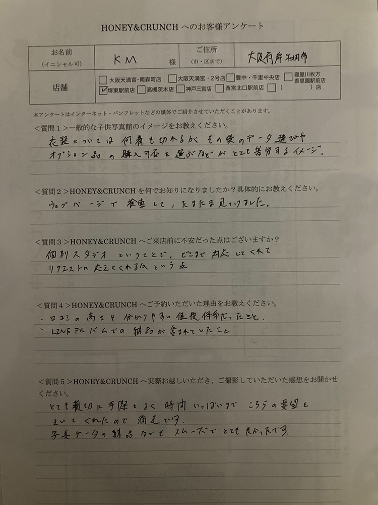 KM様口コミ評判/大阪府岸和田市より子ども写真撮影/10447連番<質問5>ハニーアンドクランチへ実際お越しいただき、ご撮影していただいた感想をお聞かせください。