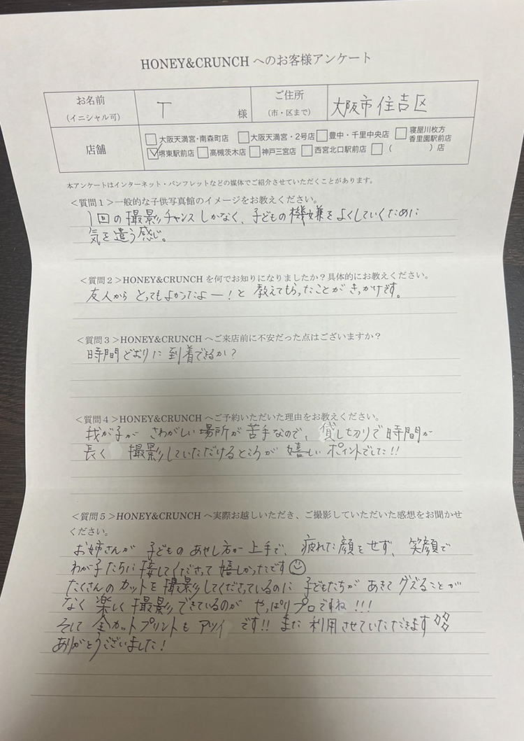 T様口コミ評判/大阪市住吉区より子ども写真撮影/10452連番<質問5>ハニーアンドクランチへ実際お越しいただき、ご撮影していただいた感想をお聞かせください。