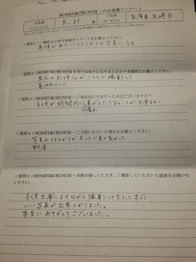 大阪で七五三の子供写真館撮影スタジオならハニーアンドクランチHOME > アンケート(口コミ・評判情報) > 兵庫県尼崎市から七五三写真撮影でご来店のR・Hさま・アンケート(口コミ・評判情報)403
