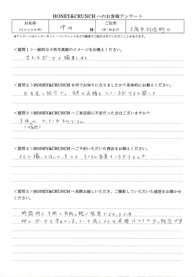 大阪で七五三の子供写真館撮影スタジオならハニーアンドクランチHOME > アンケート(口コミ・評判情報) > 大阪市阿倍野区から七五三写真撮影でご来店の中田さま・アンケート(口コミ・評判情報)444