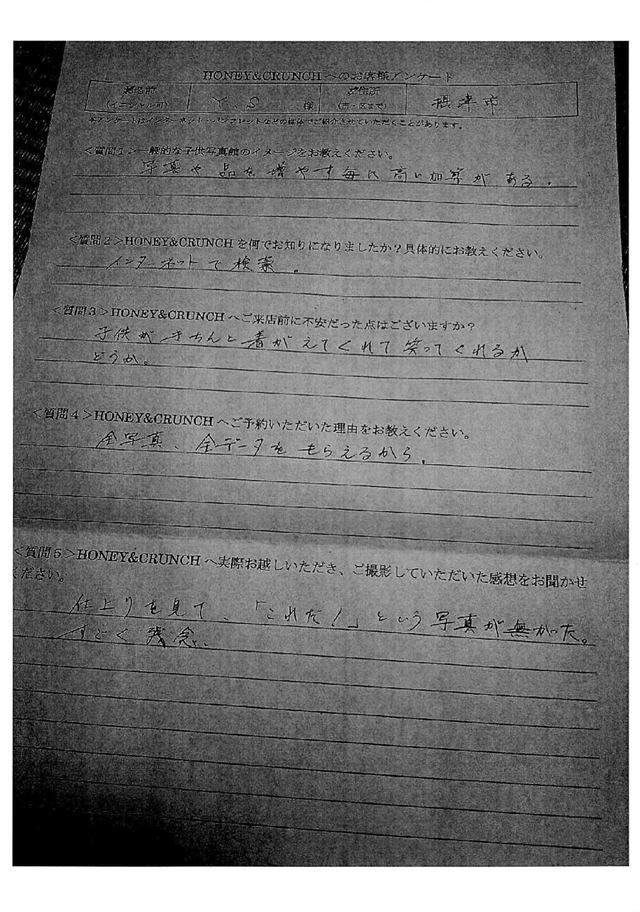 大阪で七五三の子供写真館撮影スタジオならハニーアンドクランチHOME > アンケート(口コミ・評判情報) > 大阪府摂津市から七五三・1歳誕生日写真撮影でご来店のY・Sさま・アンケート(口コミ・評判情報)446