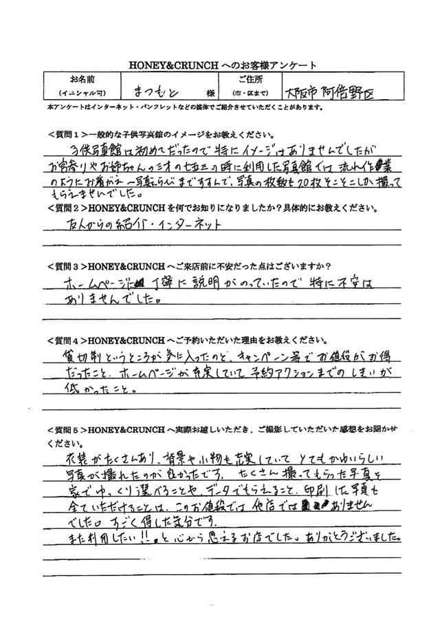 大阪で七五三の子供写真館撮影スタジオならハニーアンドクランチHOME > アンケート(口コミ・評判情報) > 大阪市阿倍野区から七五三写真撮影でご来店のまつもとさま・アンケート(口コミ・評判情報)450