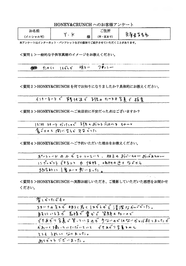 大阪で七五三の子供写真館撮影スタジオならハニーアンドクランチHOME > アンケート(口コミ・評判情報) > 兵庫県芦屋市から1歳誕生日写真撮影でご来店のY・Kさま・アンケート(口コミ・評判情報)501