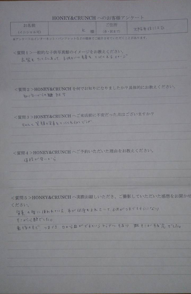 大阪で七五三の子供写真館撮影スタジオならハニーアンドクランチHOME > アンケート(口コミ・評判情報) > 大阪市住吉区から1歳誕生日写真撮影でご来店のKさま・アンケート(口コミ・評判情報)522