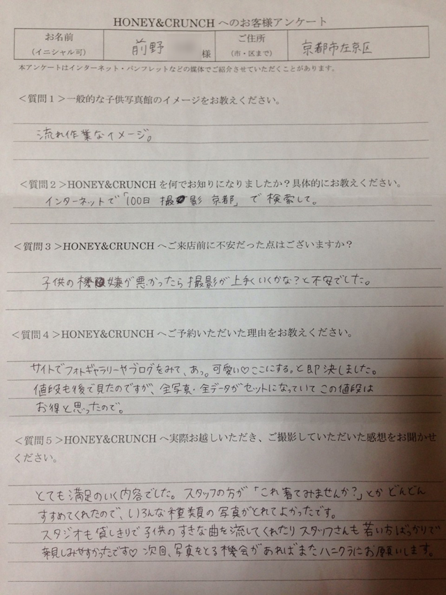 大阪で七五三の子供写真館撮影スタジオならハニーアンドクランチHOME > アンケート(口コミ・評判情報) > 京都市左京区から入学・お宮参り写真撮影でご来店の前野さま・アンケート(口コミ・評判情報)616