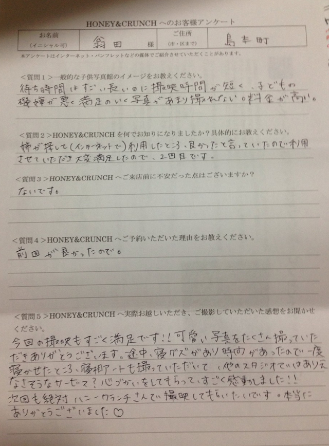大阪で七五三の子供写真館撮影スタジオならハニーアンドクランチHOME > アンケート(口コミ・評判情報) > 大阪府島本町から初節句・1歳誕生日写真撮影でご来店の翁田さま・アンケート(口コミ・評判情報)646