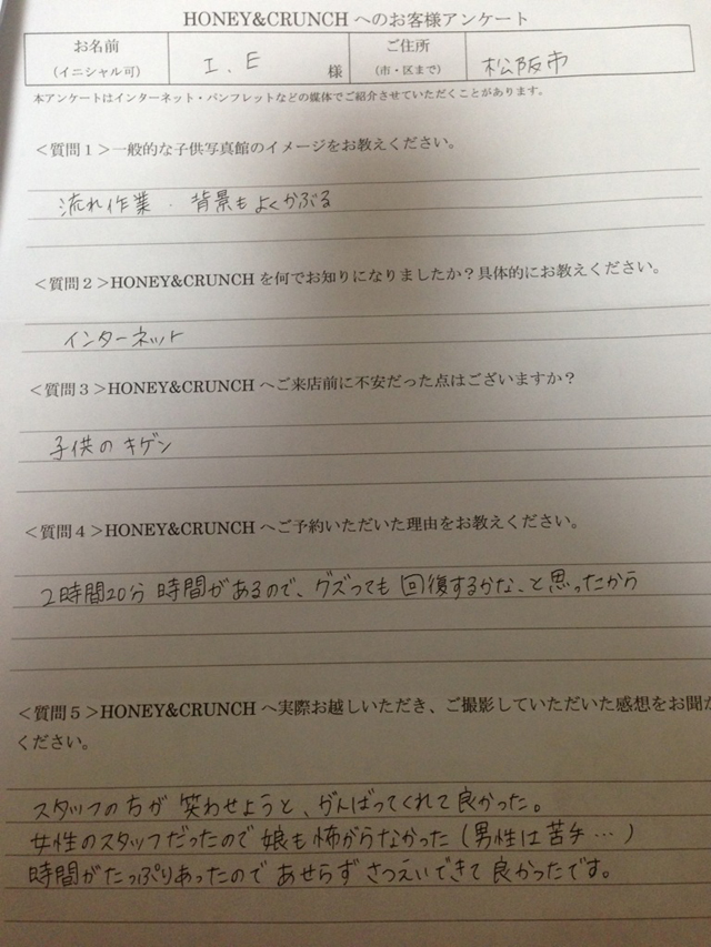 大阪で七五三の子供写真館撮影スタジオならハニーアンドクランチHOME > アンケート(口コミ・評判情報) > 三重県松阪市から1歳誕生日写真撮影でご来店のI・Eさま・アンケート(口コミ・評判情報)665