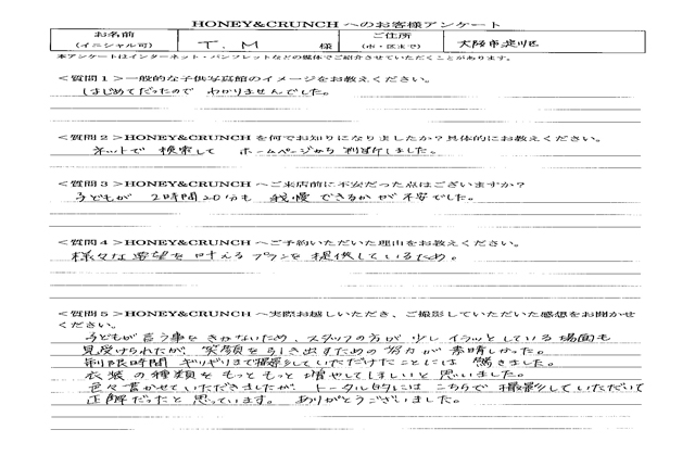 大阪で七五三の子供写真館撮影スタジオならハニーアンドクランチHOME > アンケート(口コミ・評判情報) > 大阪市淀川区から七五三写真撮影でご来店のT.Mさま・アンケート(口コミ・評判情報)726