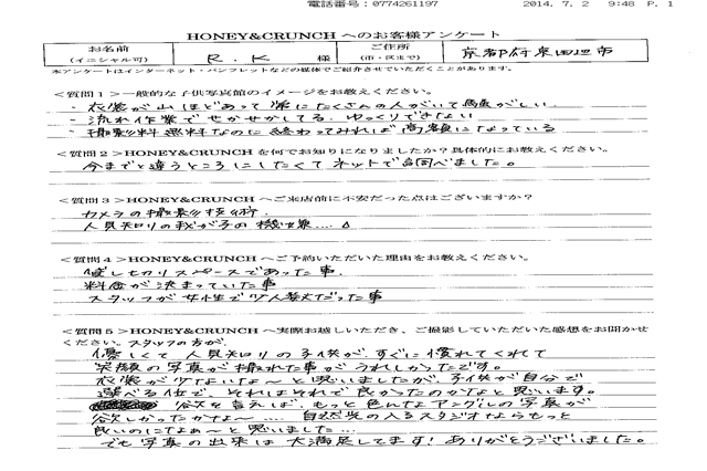大阪で七五三の子供写真館撮影スタジオならハニーアンドクランチHOME > アンケート(口コミ・評判情報) > 京都府東田辺市から七五三写真撮影でご来店のR・Kさま・アンケート(口コミ・評判情報)728