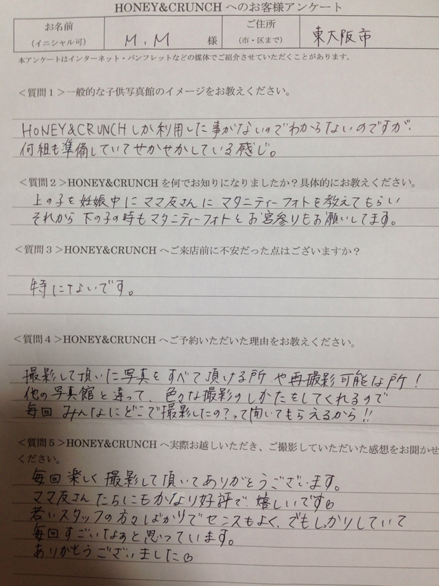 大阪で七五三の子供写真館撮影スタジオならハニーアンドクランチHOME > アンケート(口コミ・評判情報) > 大阪府東大阪市からお宮参り写真撮影でご来店のM・Mさま・アンケート(口コミ・評判情報)758