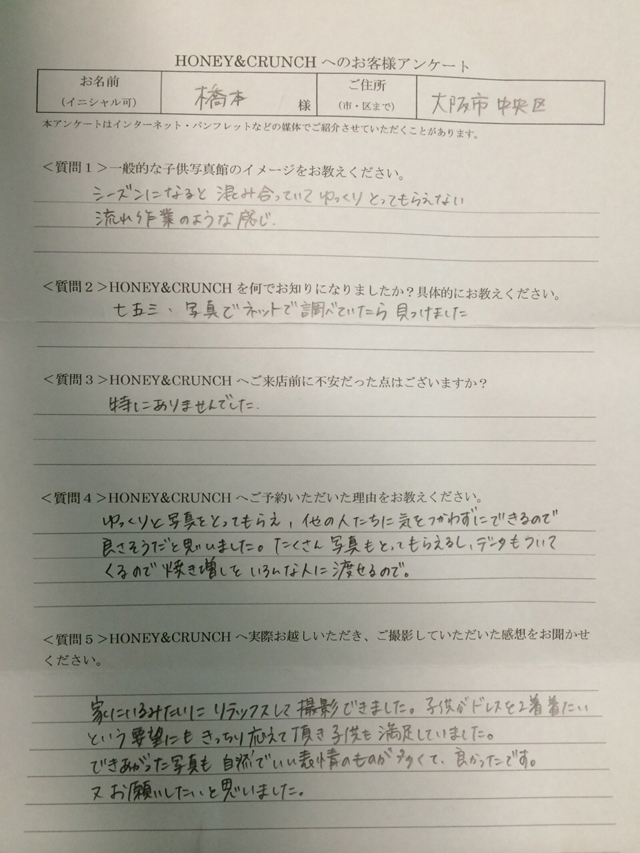 大阪で七五三の子供写真館撮影スタジオならハニーアンドクランチHOME > アンケート(口コミ・評判情報) > 大阪市中央区から七五三写真撮影でご来店の橋本さま・アンケート(口コミ・評判情報)785