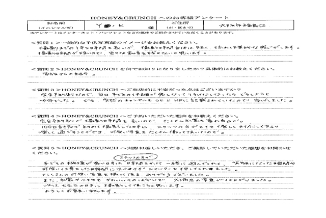 大阪で七五三の子供写真館撮影スタジオならハニーアンドクランチHOME > アンケート(口コミ・評判情報) > 大阪市福島区から初節句・誕生日写真撮影でご来店のY・Kさま・アンケート(口コミ・評判情報)872