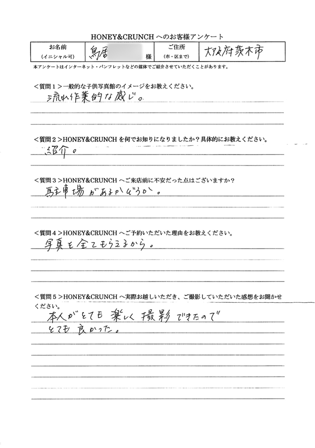 大阪で七五三の子供写真館撮影スタジオならハニーアンドクランチHOME > アンケート(口コミ・評判情報) > 大阪府茨木市から七五三写真撮影でご来店の鳥居さま・アンケート(口コミ・評判情報)915
