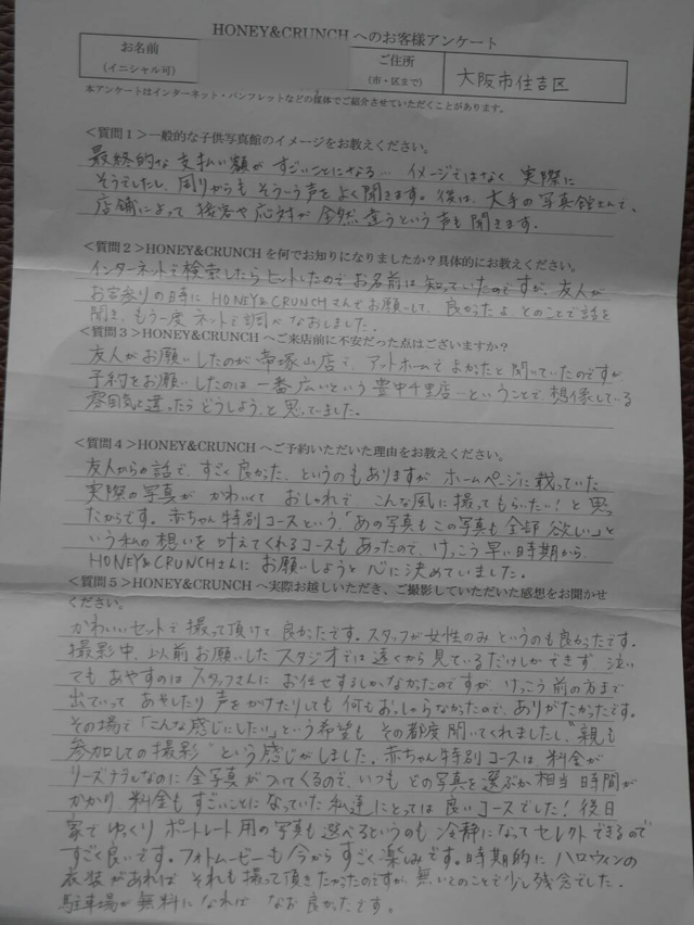 大阪で七五三の子供写真館撮影スタジオならハニーアンドクランチHOME > アンケート(口コミ・評判情報) > 大阪市住吉区からハーフバースデー写真撮影でご来店のU・Mさま・アンケート(口コミ・評判情報)917