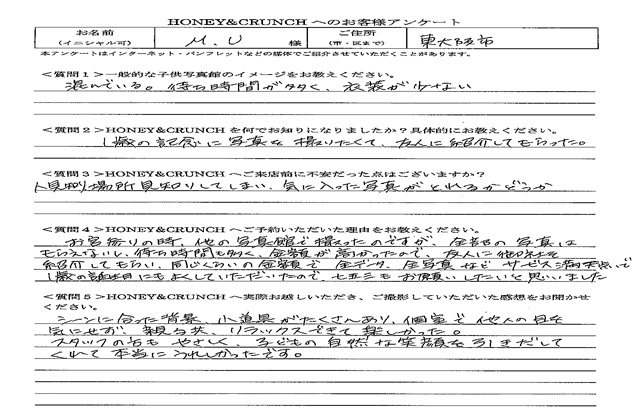 大阪で七五三の子供写真館撮影スタジオならハニーアンドクランチHOME > アンケート(口コミ・評判情報) > 大阪府東大阪市から七五三写真撮影でご来店のM・Uさま・アンケート(口コミ・評判情報)939