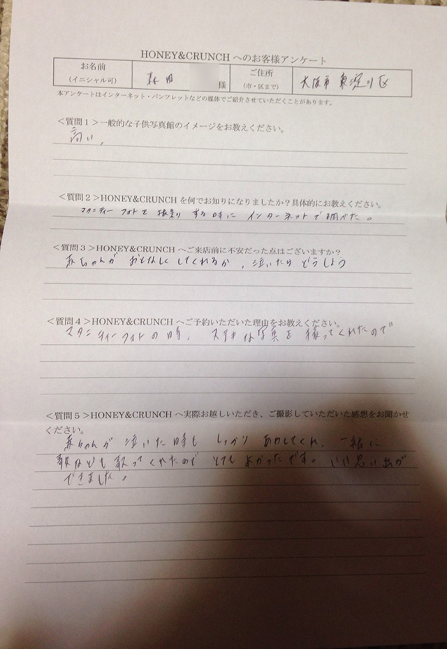 大阪で七五三の子供写真館撮影スタジオならハニーアンドクランチHOME > アンケート(口コミ・評判情報) > 大阪市東淀川区からハーフバースデー写真撮影でご来店の森田さま・アンケート(口コミ・評判情報)1238